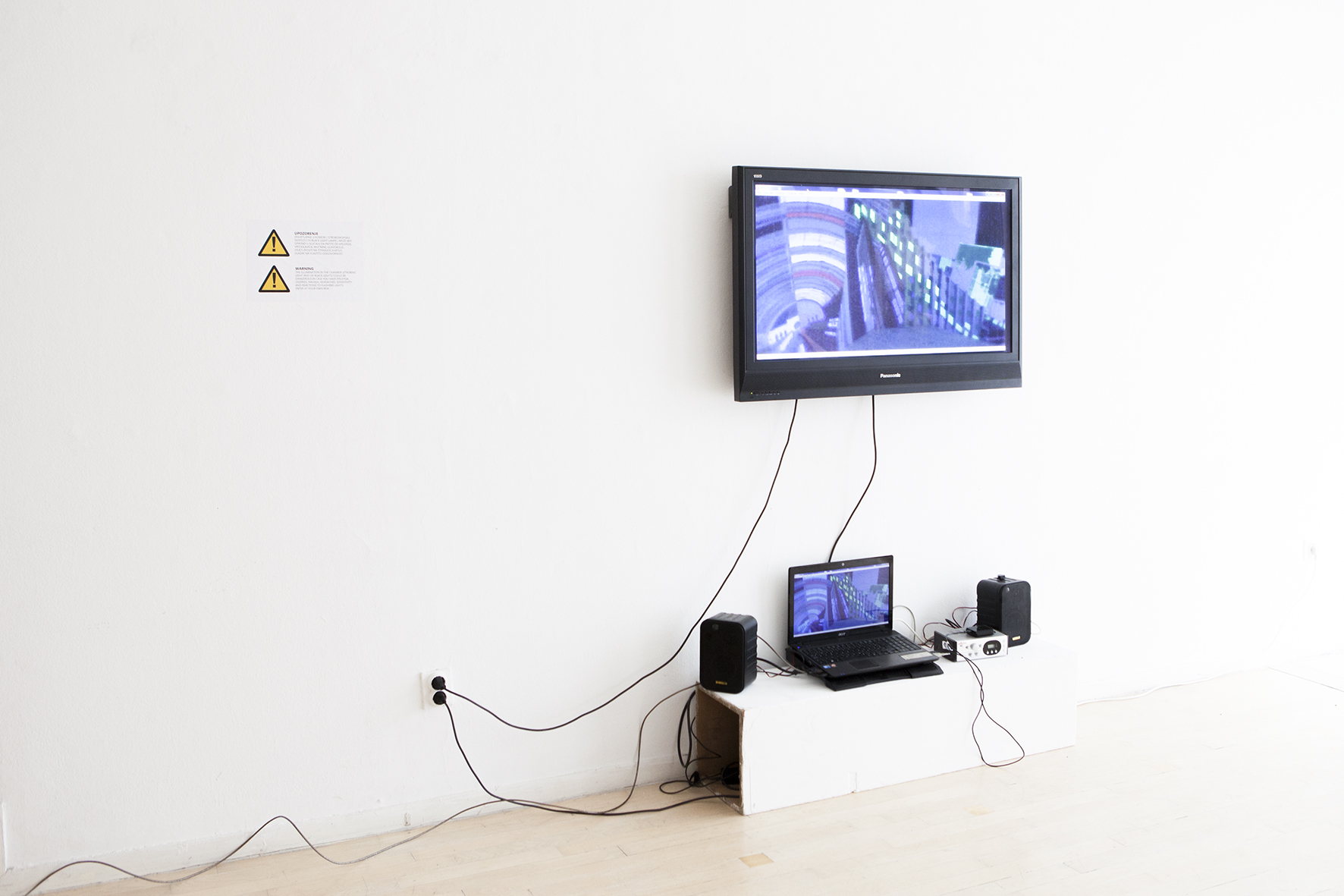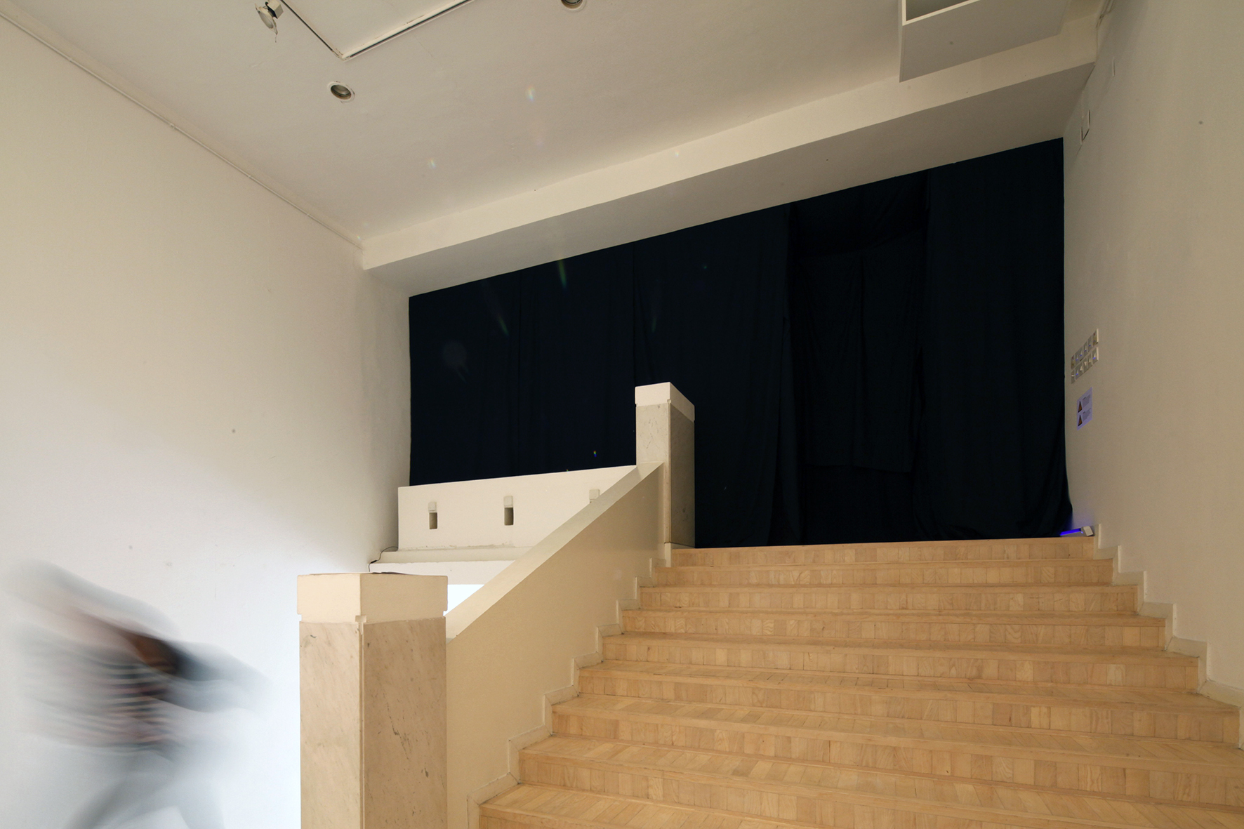 The whole ambient creates a so-called chamber that creates a collision of spatio-temporal elements. One one hand the work emphasizes and evokes the sense of being in the moment, existing in the present, which is achieved by the shift of light conditions – and on the other it annulates the notion of time as a linear phenomenon by creating a feeling of endless repetition; a type of repetition that brings us to a constant, inertia ( in therms of the psychological effect ). As a result, we experience a convergence of different spatio-temporal spaces and an exchange of two basic principles – in one case we are dealing with representation and illusion, and in other we are dealing with a visual simulation. By introducing these leaps through space and time, the viewer avoids the notion of the infinite present.