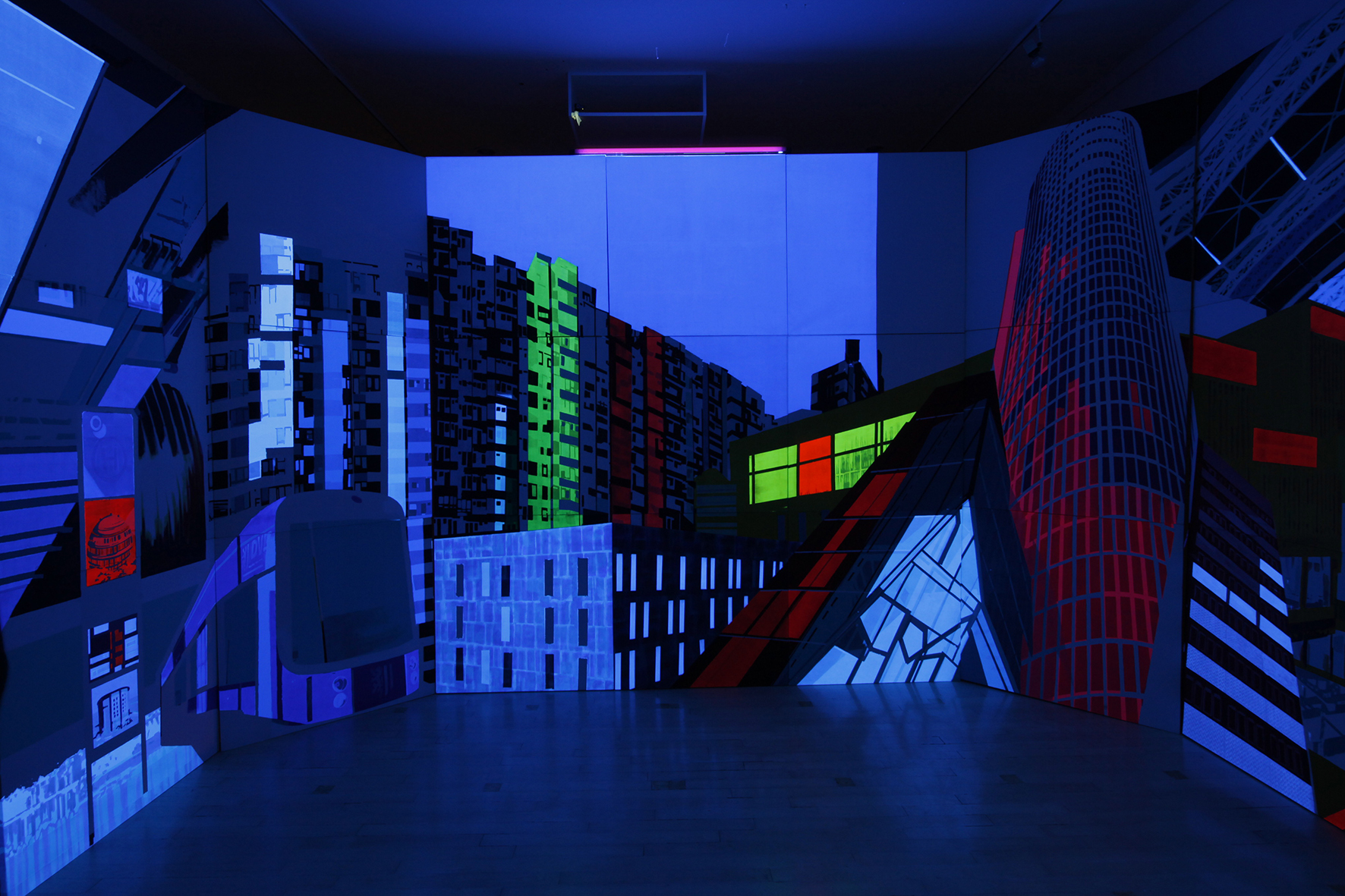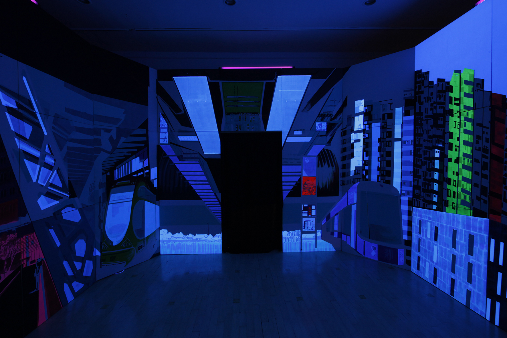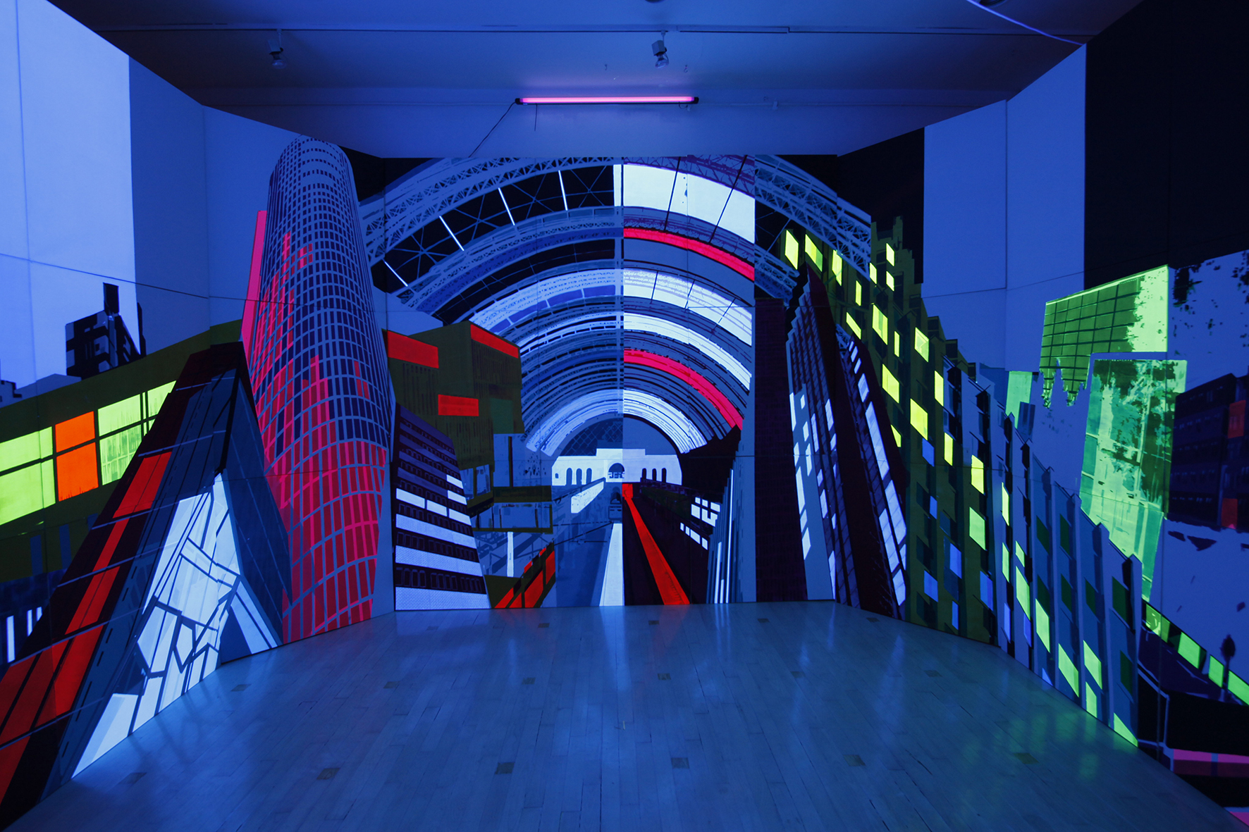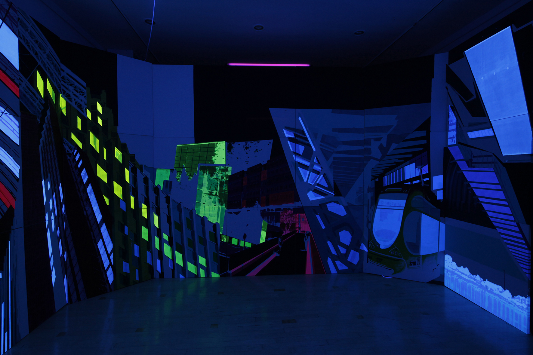 multimedia installation (UV black-lights, strobe light, projector, acrylic on canvas ), 2012