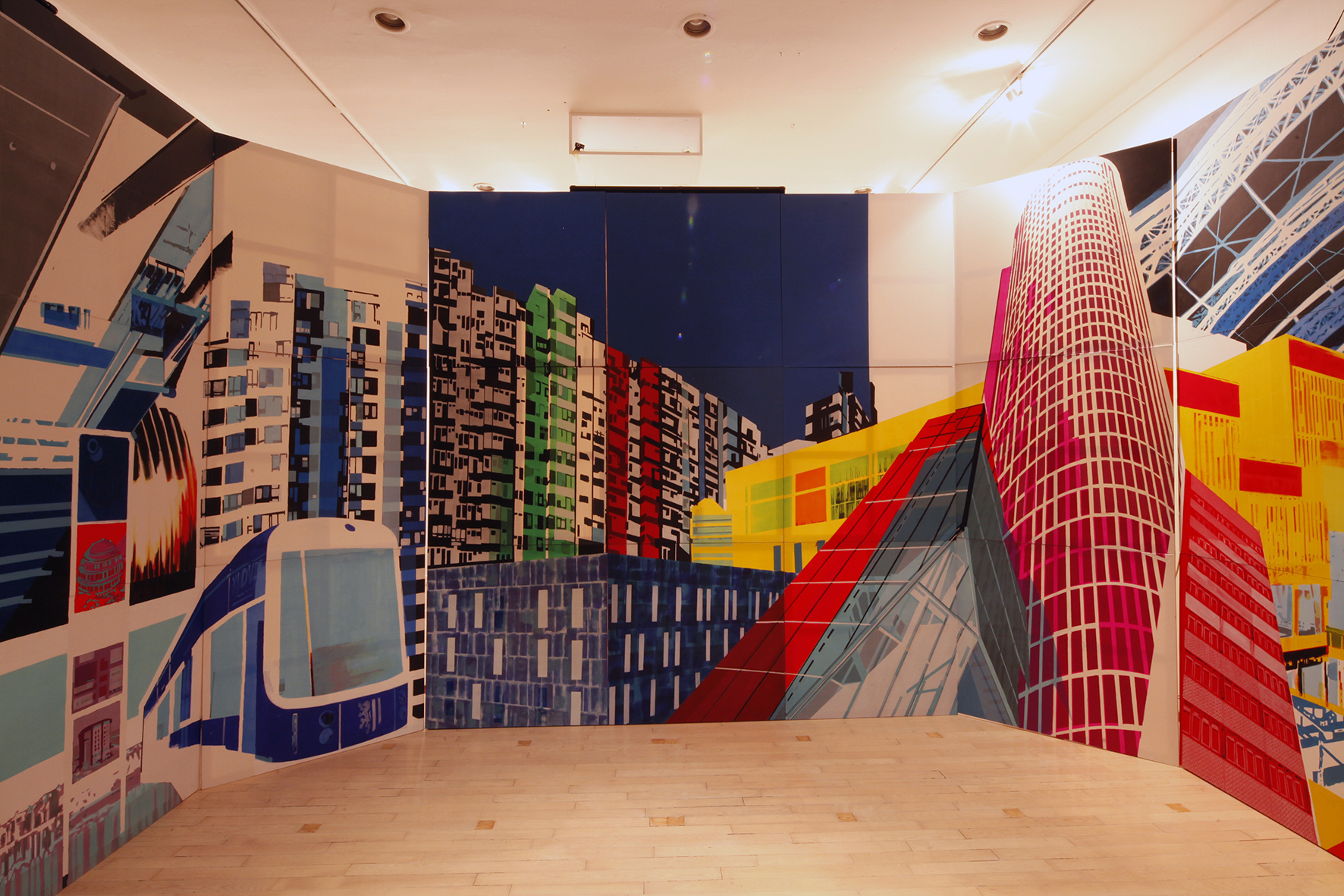 The work can be understood as a spatial installation, as well as a simulation chamber. The octagonal chamber consists of 46 paintings (100×100 cm; acrylic on canvas), UV black lights, UV sensitive acrylics and a strobe light.